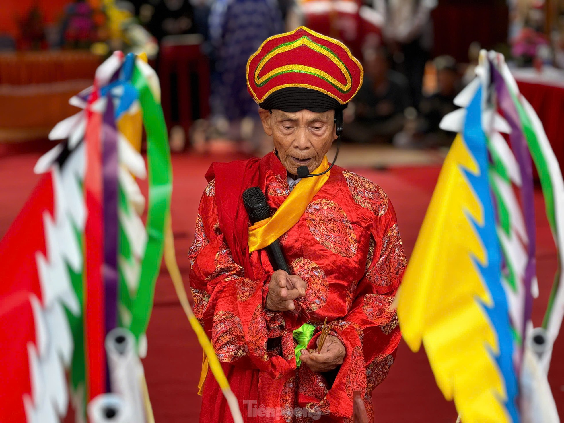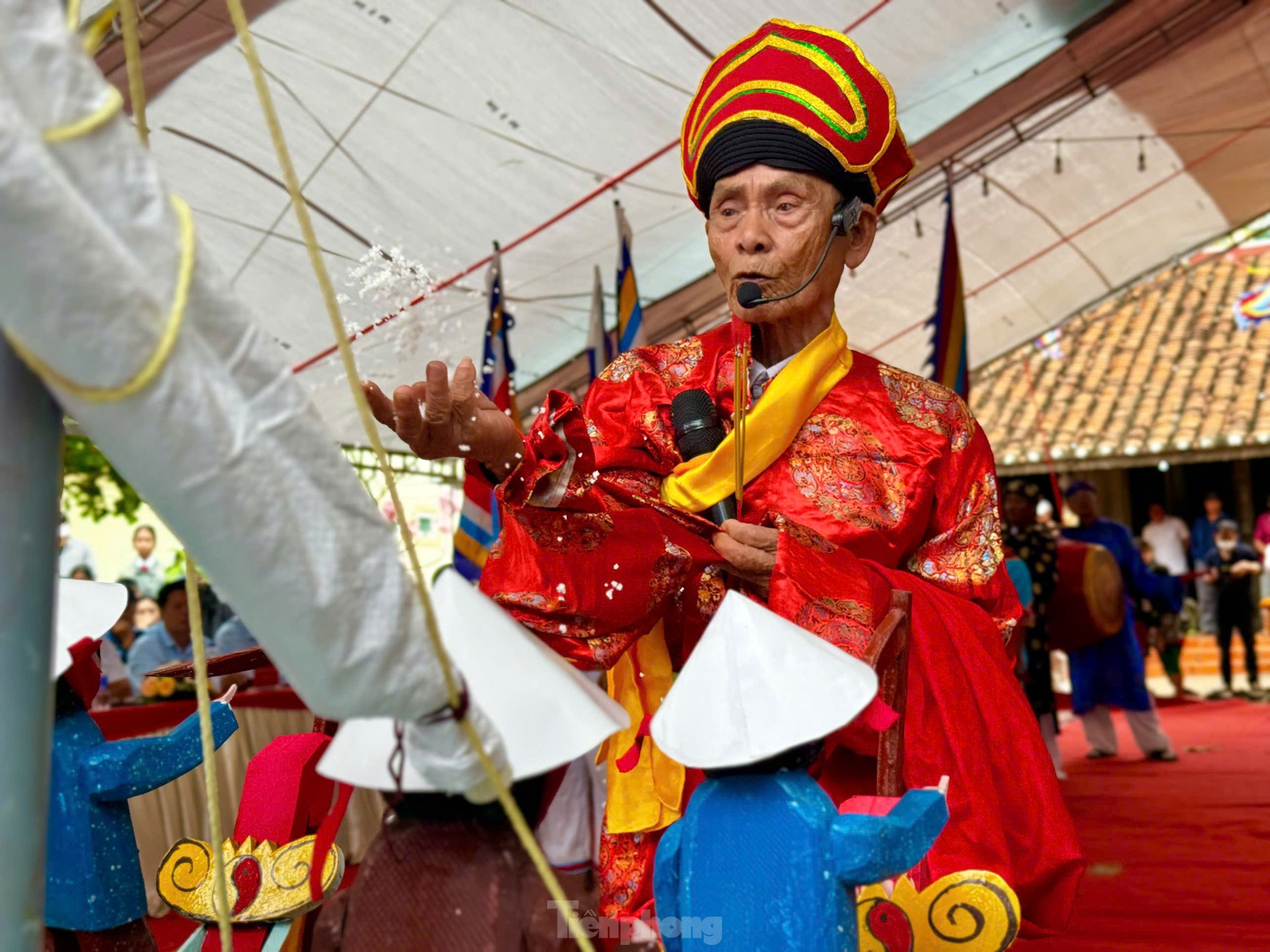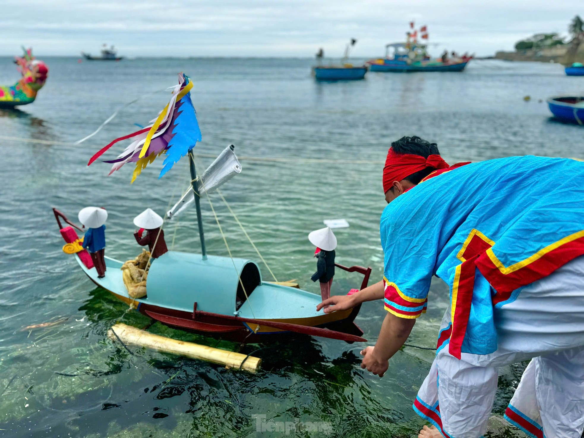 Thầy pháp thực hiện các nghi thức thế lính an vị các vong linh lính Hoàng Sa trước khi thả thuyền ra biển. Ảnh: Nguyễn Ngọc.