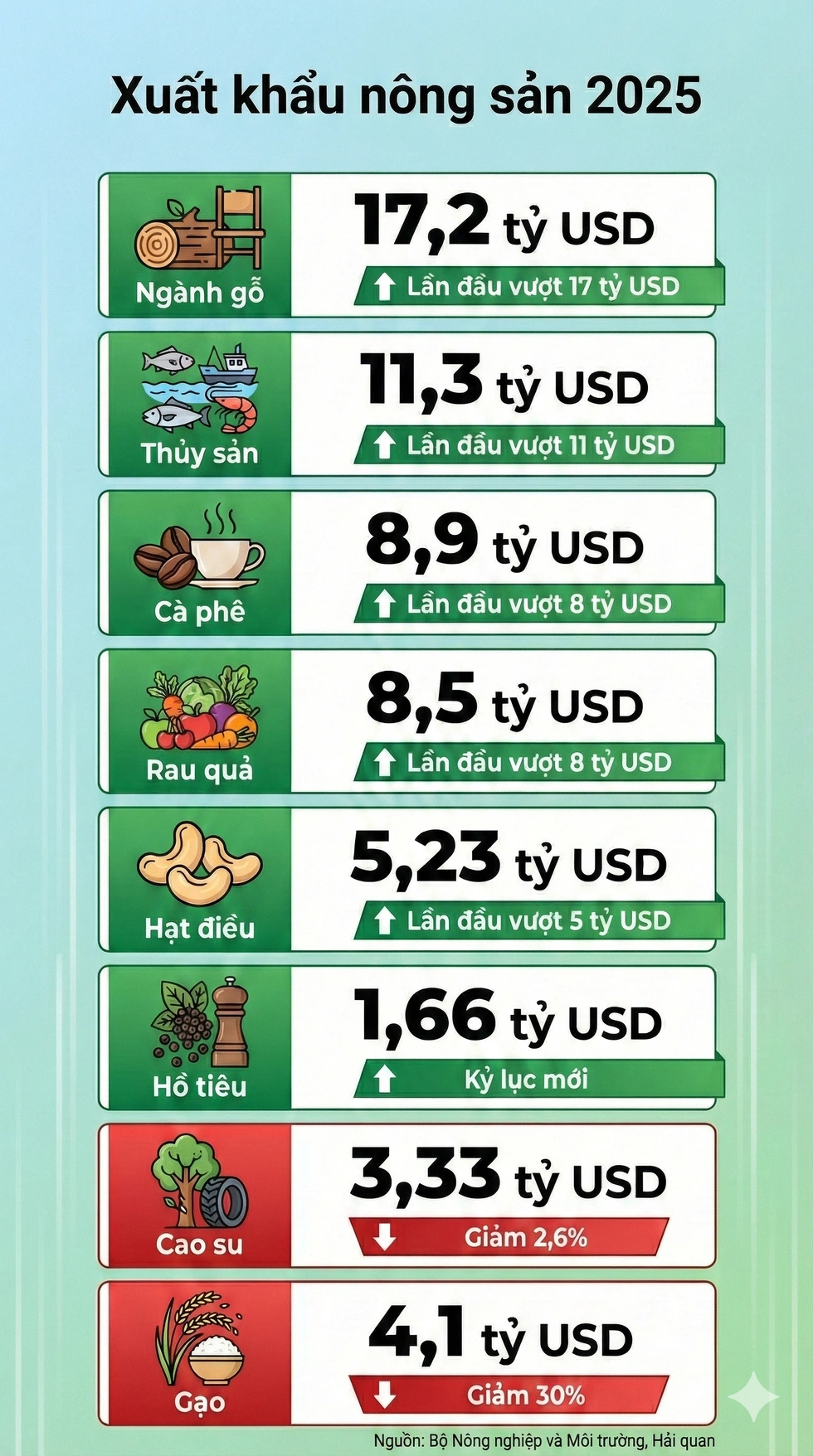 Theo Bộ Nông nghiệp và Môi trường, năm 2025, bất chấp thiên tai khốc liệt và biến động thị trường, tổng kim ngạch xuất khẩu nông lâm thủy sản của Việt Nam vẫn đạt 70,09 tỷ USD, tăng 12% so với năm trước và là mức cao nhất từ trước đến nay.