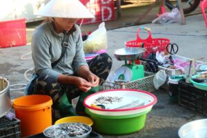 Bà Tuyền cho hay, họ đi chợ sớm để đón mua sản vật người dân đánh bắt đem ra bán, còn người dân đi chợ cũng tranh thủ để mua được đồ đồng tươi ngon cho bữa cơm gia đình.