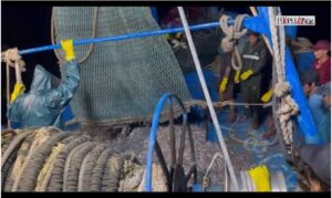 Cả hai con tàu này đều đang ngang nhiên thực hiện hành vi khai thác hải sản bằng lưới kéo đôi (giã cào bay) sai tuyến quy định. “Giã cào bay” được coi là hình thức khai thác tận diệt và hủy hoại nghiêm trọng nguồn lợi thủy sản.
